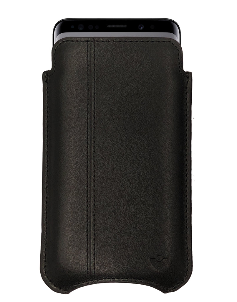 You'll love this Pirate Black genuine USA Napa leather Samsung Galaxy Plus model phone case, compatible with both the Samsung Galaxy S9+ and Samsung Galaxy S8+ models.