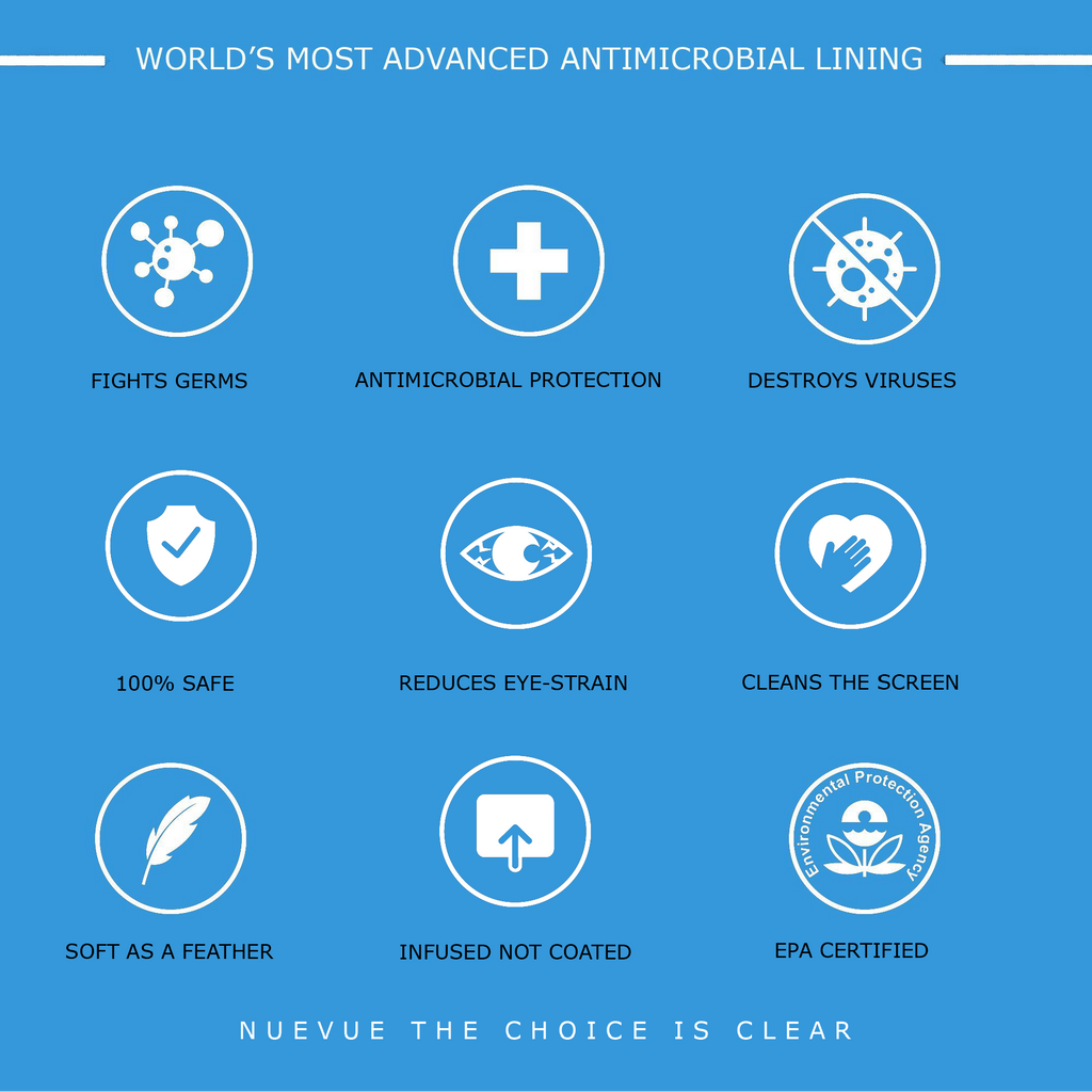 NueVue cases lining is infused the world's most advanced antimicrobial technology to eliminate 99.99% of bacteria, germs and viruses that can live and breed on your phone or Pad for days.